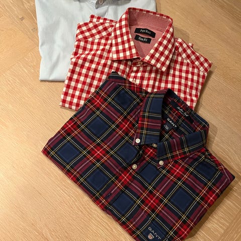 Vintage skjorte i merket ALVO. Det står ingen størrelse i den, men den ble brukt i konfirmasjon av en gutt som jeg mener var ca 170 cm. Stoffet er strykefritt. Den har en liten reparasjon på venstre arms linning, da sømmen gled litt ut. Dette vises litt fra vrangen. Målt tvers over nedrekanten av skulderstykket bak er den 42 cm, ermelengde målt på undersiden av arma er 53 cm, og lengde fra nakken 75 cm. Kr. 25 pluss porto.