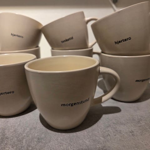 Har flere kopper med forskjellig tekst: