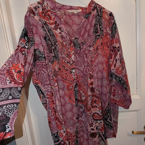 Mønstret bluse i lett stoff fra Dia Dia design i størrelse M. Trekvart ermer og knyting bak. Omkrets bryst er 116 cm, livvidde 112 cm og lengde 77 cm. Laget av 100% polyester. Pent brukt uten flekker eller skader.
