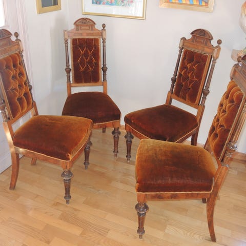 Stoler m/armlener. 2 stk. Høyde 109 cm. Høyde inkl. sete 46-47 cm. Høyde til armlene 72 cm. Bredde sete 53 cm. Treverk er i meget god stand. Møbeltrekket er rustikk ullstoff. Ryggen på stolene har pene nagler både i front og bak. De selges samlet. Pris pr. stk.