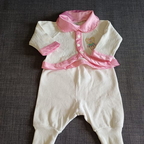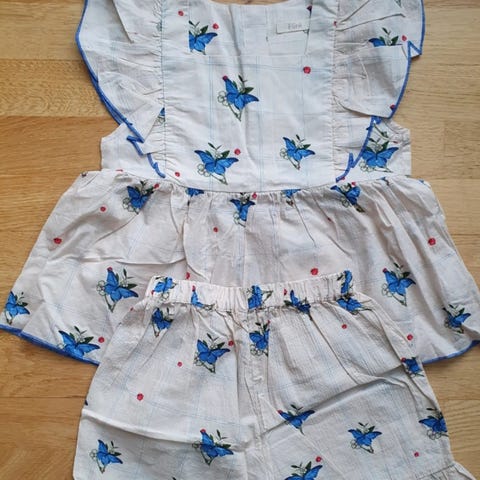 Ny bluse og bukse i str 80 selges kr 80. Er kjøpt i Spania og str er oppgitt til str 6. Tilsvarer str 80 i Norge. Har en mini flekk nederst på ene buksebeinet som mest sannsynlig går vekk i vask. Se siste bilde. Har ikke vasket den da den ikke er brukt.