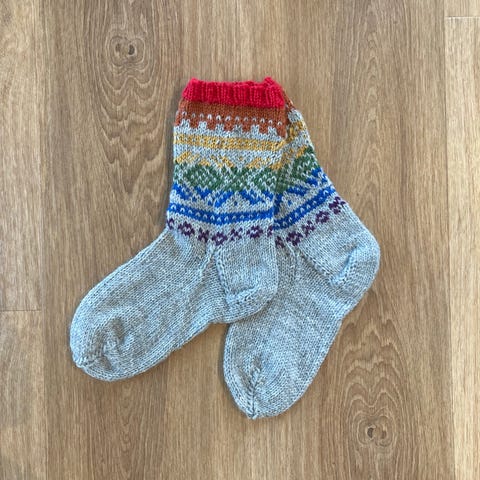 Sokker i mariusmønster, strikket i flere sorter ullgarn i glade farger. Størrelse M dame .