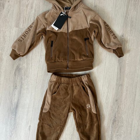 Komfortabel, stilig og ryddig fritidsdress for en gutt. Ingen tegn til slitasje. Det er ett lite skrapemerke på kneet (synlig på et av bildene) og en snøring fra hetten mangler. Ingen andre defekter .