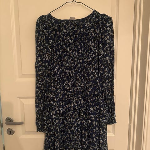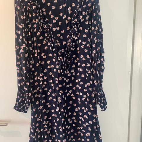 Ganni rometty georgette kjole. Marineblå med mønster i str 36. Ikke synlig brukt. Må hentes i Kristiansand eller sendes om kjøper betaler frakt.