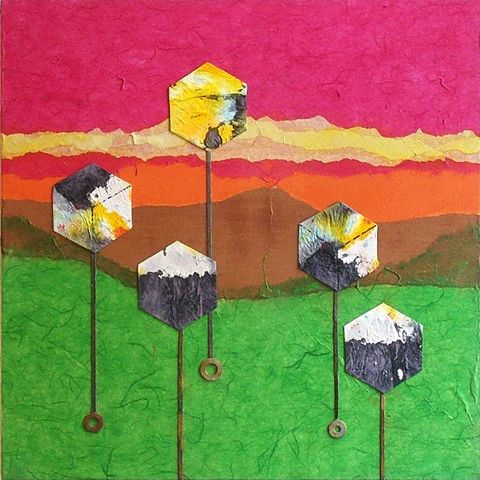 Collage av silke- og bomullspapir med speilapplikasjoner. Tittel: "I heard it through the grapevine" (2010). Mål: 100x50cm. Bildet er signert. Kr.1200