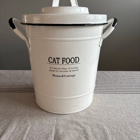 Boks til kattemat i metall. Godt brukt, men like hel og fin. Noen bruksmerker