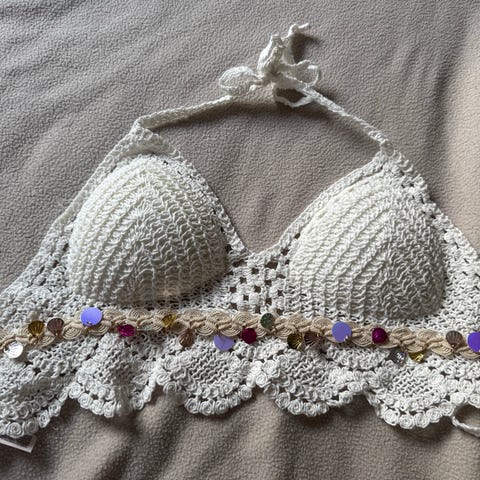 Nydelig feminin bikini overdel fra det britiske merket ALL SAINTS i str. S selges. Brukt et par ganger og fremstår som ny. Behagelig i stoffet: 88% nylon, 12% elastan (lappen har blitt tatt av). Tøffe detaljer! Kjøpte i Italia. Ordinær pris er kr 850.