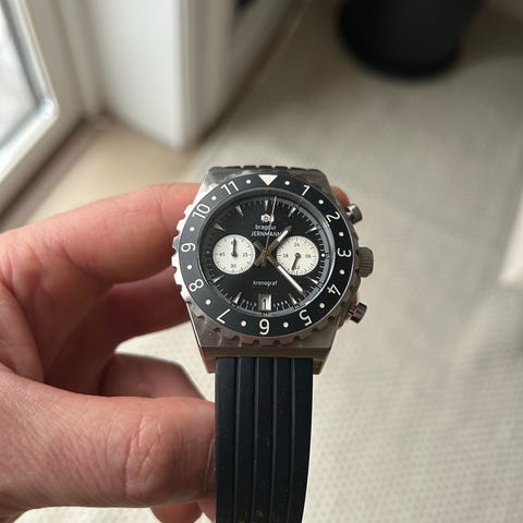 Selger en stilig og robust Åkerfalk AVENTYR fra Sverige. Dette er en unik klokke med et karakteristisk design og 24-timers skive, perfekt for deg som liker noe litt annerledes.