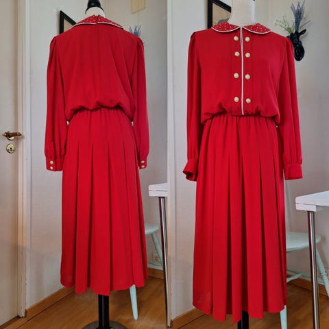 Vintage rød mønstret kjole fra Freddy+fashion. Ikke merket med størrelse, men passer størrelse XS. Omkrets bryst er 76 cm, livvidde 66 cm og lengde 104 cm. Knapper hele veien ned i front, vidde i skjørtet og lommer i siden. Stoffet kjennes ut som bomull. Pent brukt uten flekker eller skader.