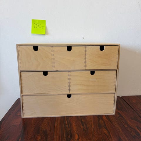 Skap 2: blå med 2 store rom+3 små rom. 300kr
