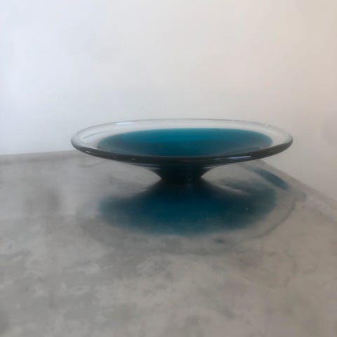 Basen er mørk rød-brun med relieffmønster i grønn blå-turkis. Abstrakt, sirkulær dekor. Hver side har noe ulike fargenyanser. Uten skader. Preget under Carstens logo nr 7856-25 W.Germany