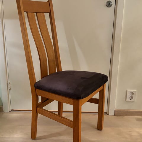 Viser bruk på treverk, se bilder. Lysoljet eikespiler. Sort skinn. Passer til alle typer spisebord/ kjøkkenbord. Kan også brukes til ekstrastol, å til bruk å henge klær på, på soverom, gang, bad.