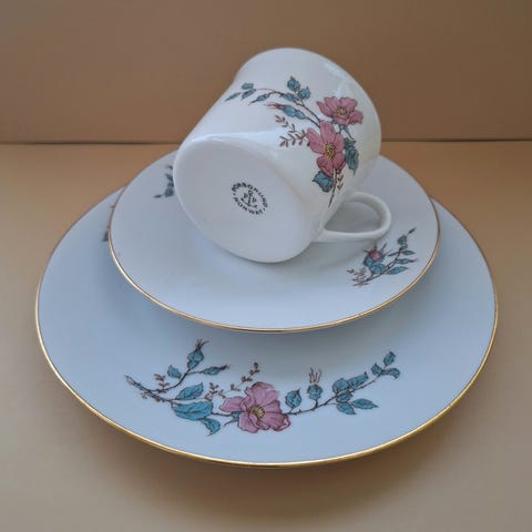 Kaffeservise til 5 personer fra Porsgrund porselen selges for 395 kroner (kopp: høyde 5,5 cm / diameter 9 cm. Skål/asjett: diameter 13 cm / 17 cm. Følger med en ekstra asjett. Skår i den ene koppen, se bilde). K30. Fraktkostnader: PostNord - 69 kroner. Betaling via vipps.