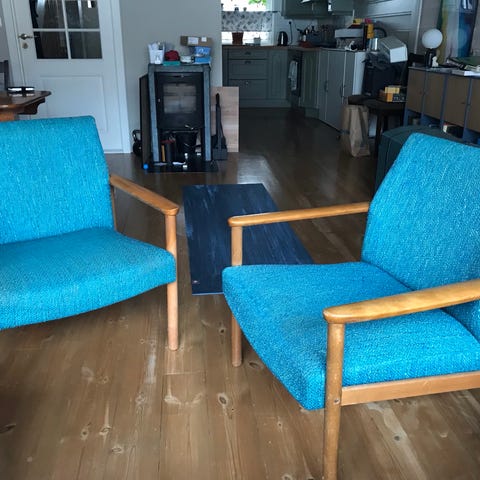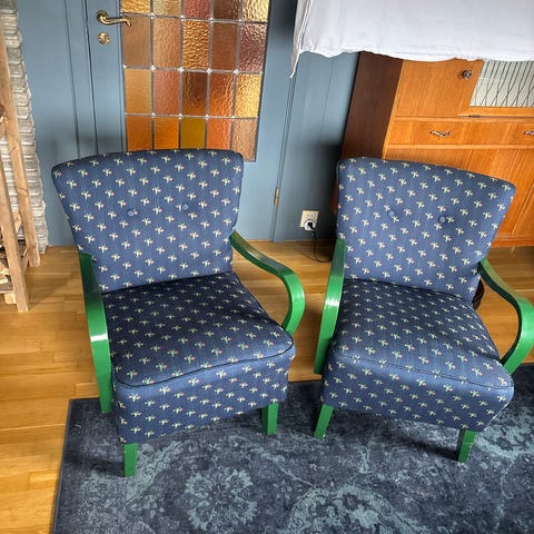 2 behagelige lenestoler fra ca 1895-1900 til salgs. MÅ trekkes om. Kr.550.- pr stol eller 1000.- for begge.