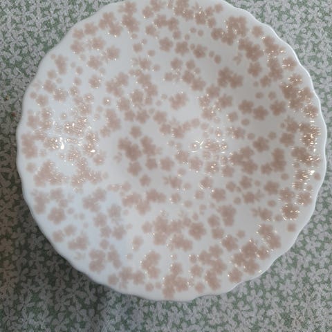 Nydelig fat med rosa blomster og tynn gullkant ytterst