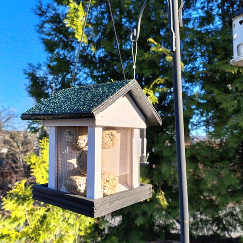 Designet er utformet slik at småfuglene sitter trygt og i le - her kommer ingen store fugler og forstyrrer matfreden (skjærer og kråker kommer seg ikke inn).
