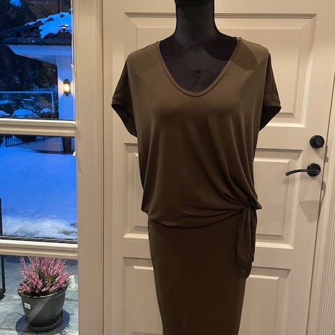 Ledig passform ▪ Kort armer ▪ Hofte lang ▪ Splitt på sidene nederst ▪ Dyp V - utringningen foran og på ryggen ▪ Krøller ikke ▪ Ikke gjennomsiktig ▪ Rett fasong ▪ Kan godt brukes med en belte over