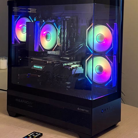 Vi har komplementert kabinettet med M25 vifter fra Phanteks, der de 4 innsugviftene er av den reverserte varianten, noe som gjør at alle viftene ser like ut uavhengig av retningen på luftstrømmen. Sammen med den massive radiatoren på 420mm sørger de for at systemet holder seg godt og kjølig, og gjør at all mulig ytelse kan hentes ut fra den superraske 9800X3D prosessoren.