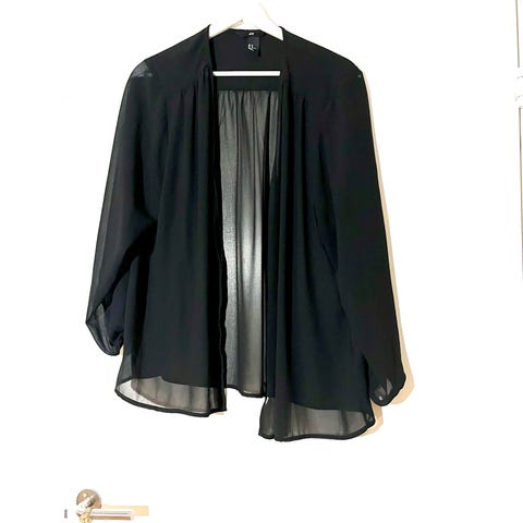 Svart bluse i størrelse 44 selges. Ermene kan strammes/løsnes ved hjelp av tråder (se bilder for mer info). Strammer opp/løsner opp, alt ettersom hvor du vil ermene skal ligge. Jeg har strammet dem nå, da går de opp til albuene cirka☺️🙏