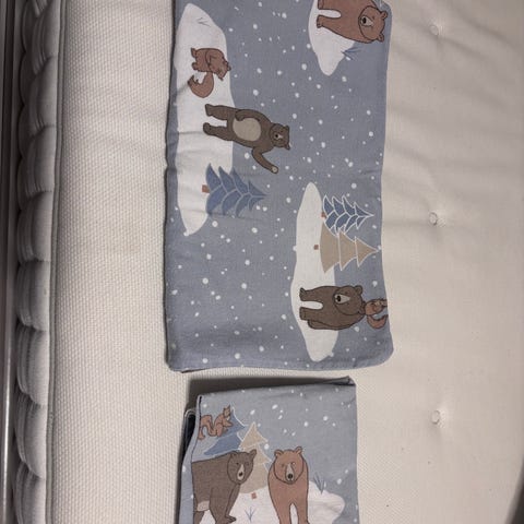 4 sett sengetøy til sprinkelseng. I god stand. De to øverste har matchende putetrekk, de to nederste har putetrekk, men de matcher ikke dynetrekket. Det hvite øverste er ubrukt, men vasket. Alle fire er i bomull, det beige er i deilig myk og varm flanell (en type bomull). Nypris for det i flanell er 350 kr. Nypris for det hvite ubrukte er 399 kr. Begge de to øverste er i økologisk bomull.