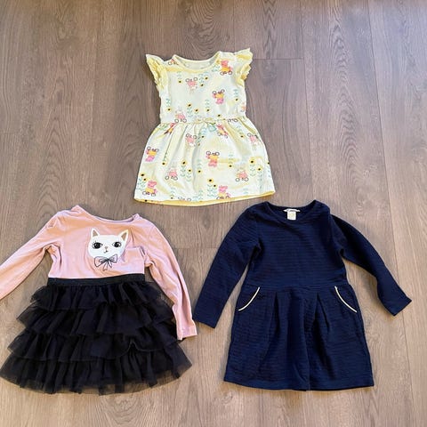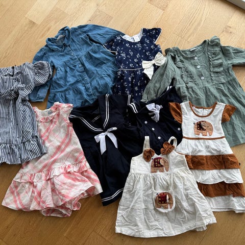 Kjoler til ulikt brukt, både hverdag og fest. En langermet strikket hvit cardigan som passer svært godt til de pene kjolene. Kjoler fra Newbie, Reflex, Name It, Lindex.