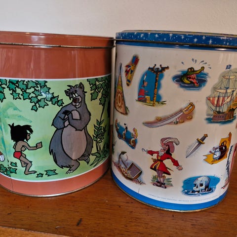 Gammel kakeboks, blikkboks med et nydelig motiv av ender