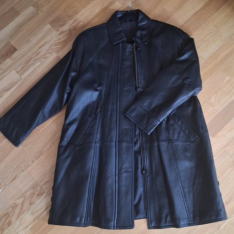 Lang, svart ekte skinnkåpe fra HM. Utsiden er laget av 100% ekte skinn, innsiden er laget av 77% akryl og 23% polyester. Se bilder med mål. Kan sendes med Post Nord for 69kr. Prisen er fast og diskuteres ikke.
