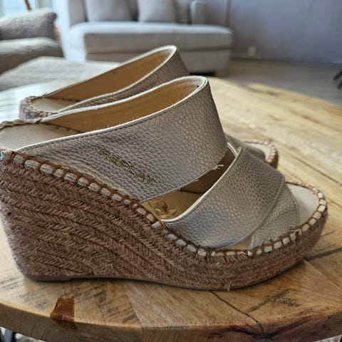 Kileheler /wedges i gullfarge, kun brukt et par ganger. Veldig gode å gå med. Selges da de ikke blir brukt.