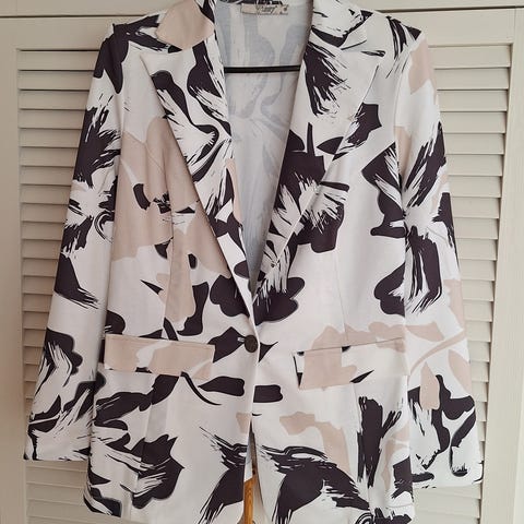Vintage Just Cavalli Blazer str 48 (italiensk størrelse). Laget av 98% bomull og 2% andre fiber. Den har skulderputer. Den er er ca 56.5 cm lengde, målt på ryggen. 3/4 lengde ermer. Jeg bruker str 38 og denne tilsvarer nok ca str 40.