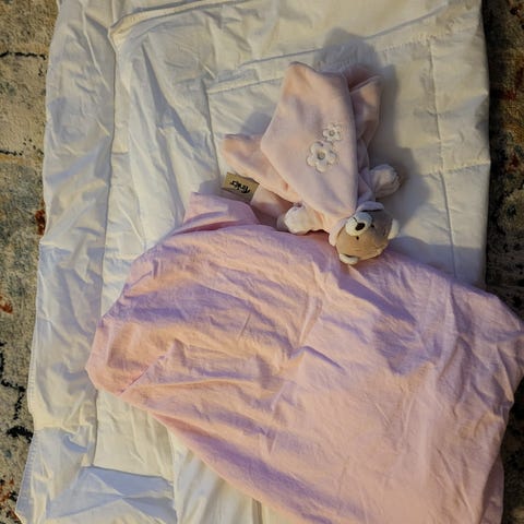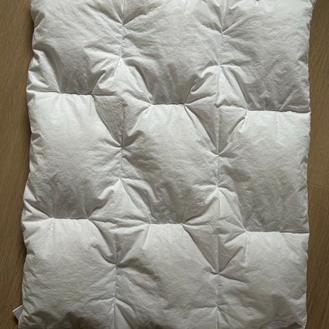 Selger en helt ubrukt barnedyne i størrelsen 80x100 cm. Dynen har trekk i 100 % bomull og 300 g fyll av hulfiber, som gjør den pustende og allergivennlig – perfekt for små barn i sprinkelseng, vogge eller vogn.