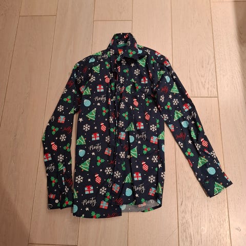 Hvit skjorte og stripete slips. Str 14 år. Pris 100,-