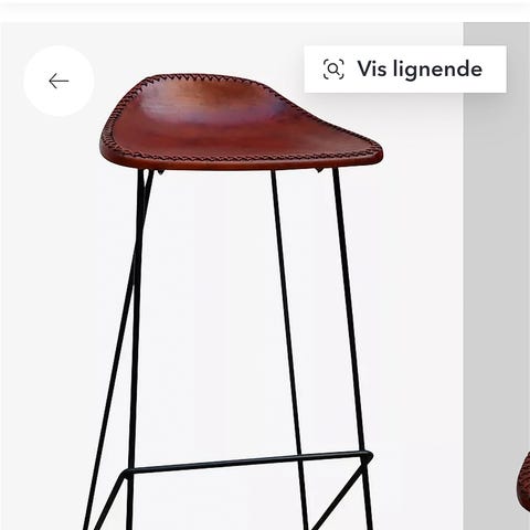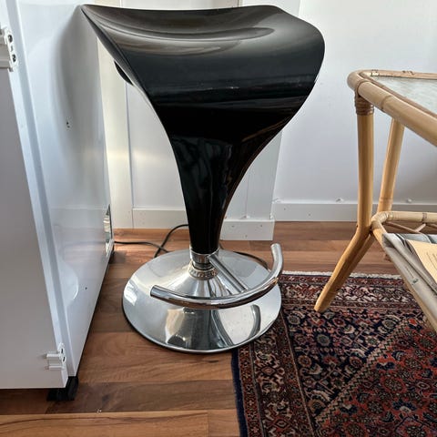 Barstol med et moderne design. Laget i tre og trukket med et svart skinn. Setets høyde er lett regulerbar med hjelp av spaken under setet. Stolens trompetfot er laget av stål og er utrustet med fotstøtte.