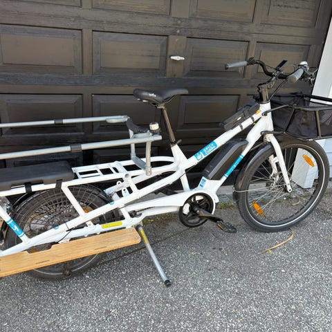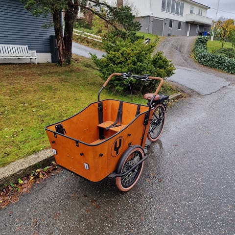 Sykkelen kan bli utstyrt med seter og belter for 2 barn, regntelt, dør foran på boksen og hanskerom hvis ønskelig og merpris.