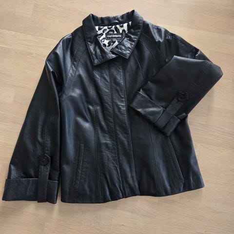 Skinnjakke laget av ekte skinn og semsket skinn. Beslag av høy kvalitet. Jakka er lite brukt.