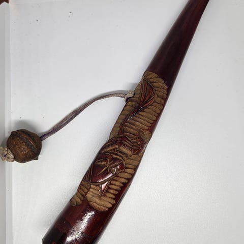 Kniv 1. Blad: Maihkel Eklund. Skaft: Almknute med hull til lillefinger. Utskåret beverunge på toppen. Holk: Bøffelhorn. Innlegg: Vulkanfiber, polert med Danish oil. Slire: Rålandslær, pautet hjort, farget. Lengde: 21 cm. Pris: 2500,-