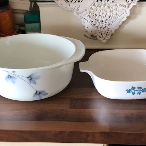 To små beige ildfaste skåler. Lengden inkl hankene er 23cm. Mål kortside er 10,5cm. En strek i glasuren se bilde. Selges samlet 🌼 kan sendes med PostNord til 70kr. Minner om Le Creuset men er ingen merking.