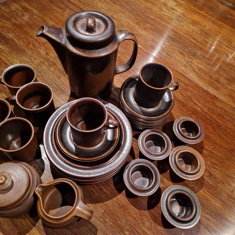 Sjeldent servise fra 1987 Designet av Dorrit von Fieandt og muligens Ulla Procopé. Håndmalt servise fra Arabia, Finland
