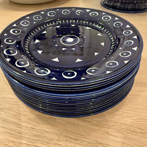 2 dype tallerkner (dia 22,5 cm). Er pene. Har litt bruksslitasje på midten. Kr 280 pr stk.