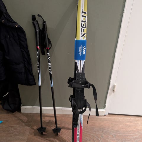 Pent brukte ski. Festes i vanlige vintersko. Fine til livets første skiturer
