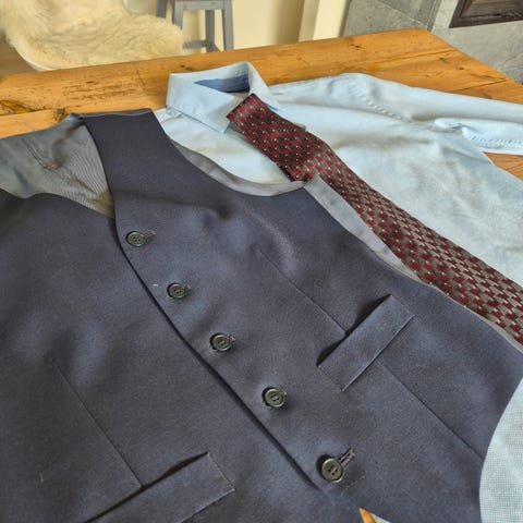 Mørk blå dress med bukse, vest og blazer i str 16 år selges. Lett melert i fargen.