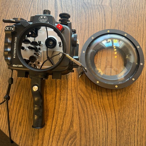 Pent brukt blits, ikke veldig mange dykk og noen av dem i ferskvann også. Aldri vært lekkasje. Drives av 4 stk AA batterier. Nypris blits 5890,- og optisk kabel 1290,- hos https://explore.omsystem.com/. Selges pga systemendring