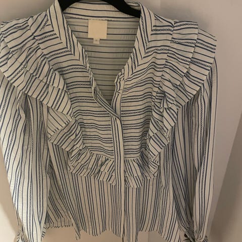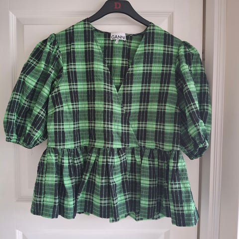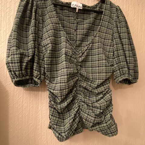 Ganni Stripete skjortebluse, passer til mange anledninger. Denne blusen er laget av høykvalitetsstoff og er i en nydelig grønn farge. Nøkkelfunksjoner: Høykvalitetsstoff | Stripete mønster | Klassisk krage | Knappelukking foran | Dimensjoner og passform: Normal passform . Str 36. Brukt en gang, som ny. Nypris 1795;