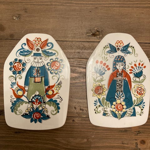Mors og Mille veggdekorasjon laget i keramikk med håndmalt blomster- og figurmotiv. Dekorasjonen har hull for oppheng og viser en figur med fargerike blomster i rød, gul, grønn og blå. Produktet er laget i Norge og har tydelig signatur på baksiden. Figgjo