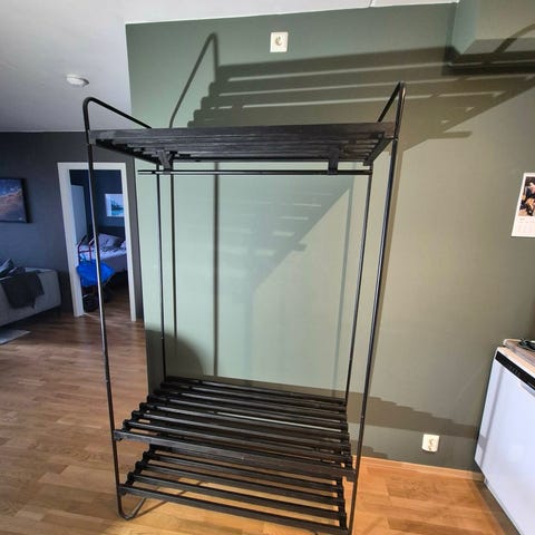 Selger som ny klesstang med oppheng. Stangen er 100cm lang og 25mm i diameter. Perfekt for montering under hylleplater eller i skap.