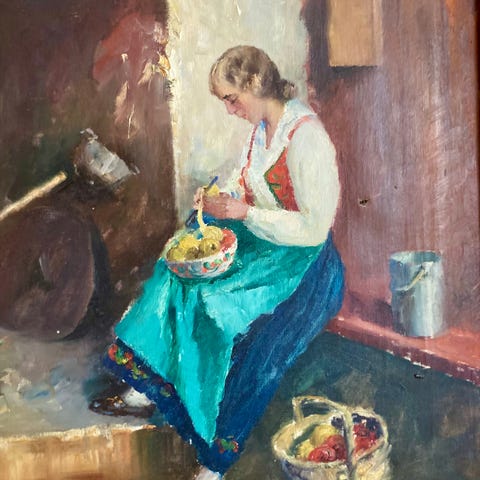 Johnny Oppenheimer var en tysk-svensk kunstner kjent for sine stillebenmalerier, ofte med motiver som kobberbøtter, tresleiver og mortere. Ett eksempel er dette trykket av maleriet “Still Life with Copper Bucket, Ladle and Mortar” fra 1976, signert J. Oppenheimer.