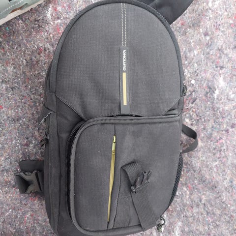 Pent brukt praktisk Vanguard fotosekk til speilrefleks, el.. Regntrekk, plass til nettbrett eller laptop i ryggen. Feste for monopod eller annet lite fotostativ på siden ab sekken. Hovedrom med tre åpningsmuligheter. Veggene i hovedrommet kan endres etter behov.