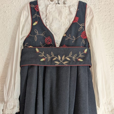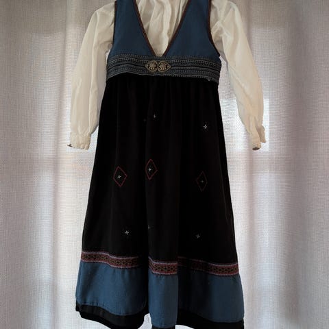 Flott festdrakt til 17. mai eller andre store anledninger. Forseggjort kjole med pene broderier.