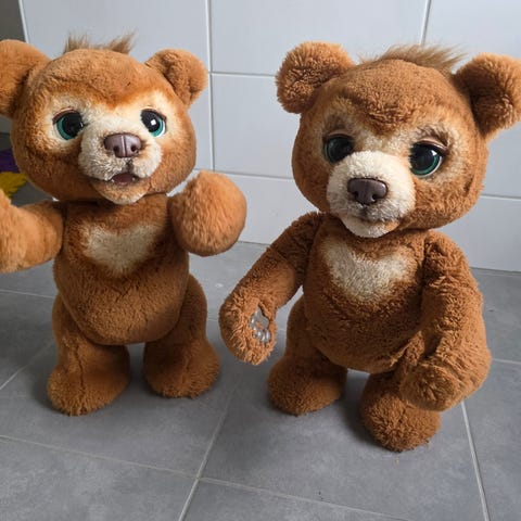 Skjønn Hasbro Fur Real Cubby bamsebjørn. Den koser, lager koselyder og er nysgjerrig. Knapp som skrur av og på. Kjempepopulær bamse-venn. Mangler drikkeflasken, derav pris. Kan bruke dukke drike flasker eller sannsynligvis kjøpe tilsvarende på nettet.