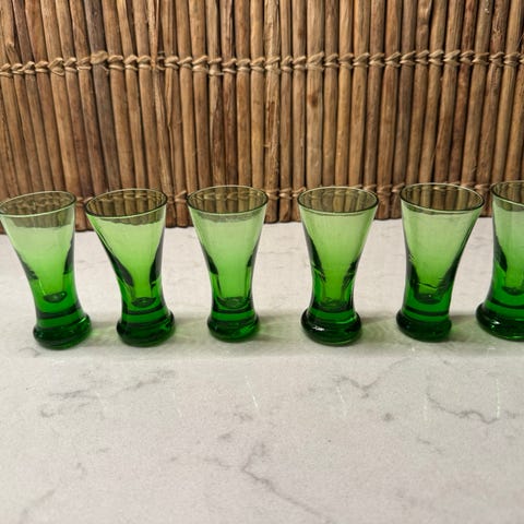 6 meget pene shorglass. Ulike farger diameter ca 6, høyde ca 8 cm. Pris samlet