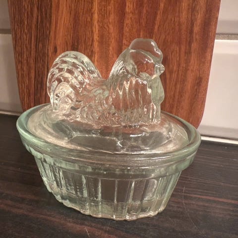Påskepynt? 2 små egghøner i pressglass. Umerket, ukjent produsent. Den hvite i melkefarget glass har lengde 175mm, bredde 150mm, høyde 120mm, vekt 796gram. Den blanke har lengde 125mm, bredde 95mm, høyde 100mm, vekt 509gram. Den hvite har fått knekt av nebbet og har et par sprekker og småmerker på kurven, den blanke fremstår i meget pen stand.